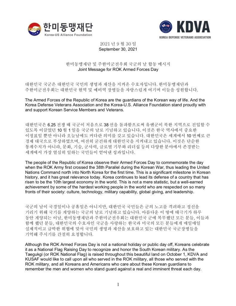 Joint Message for ROK Armed Forces Day kdva1 4 years ago Share this: Share on X (Opens in new window) X Share on Facebook (Opens in new window) Facebook