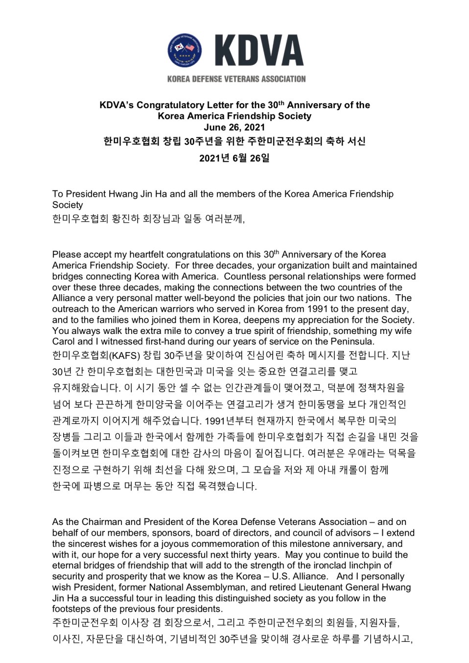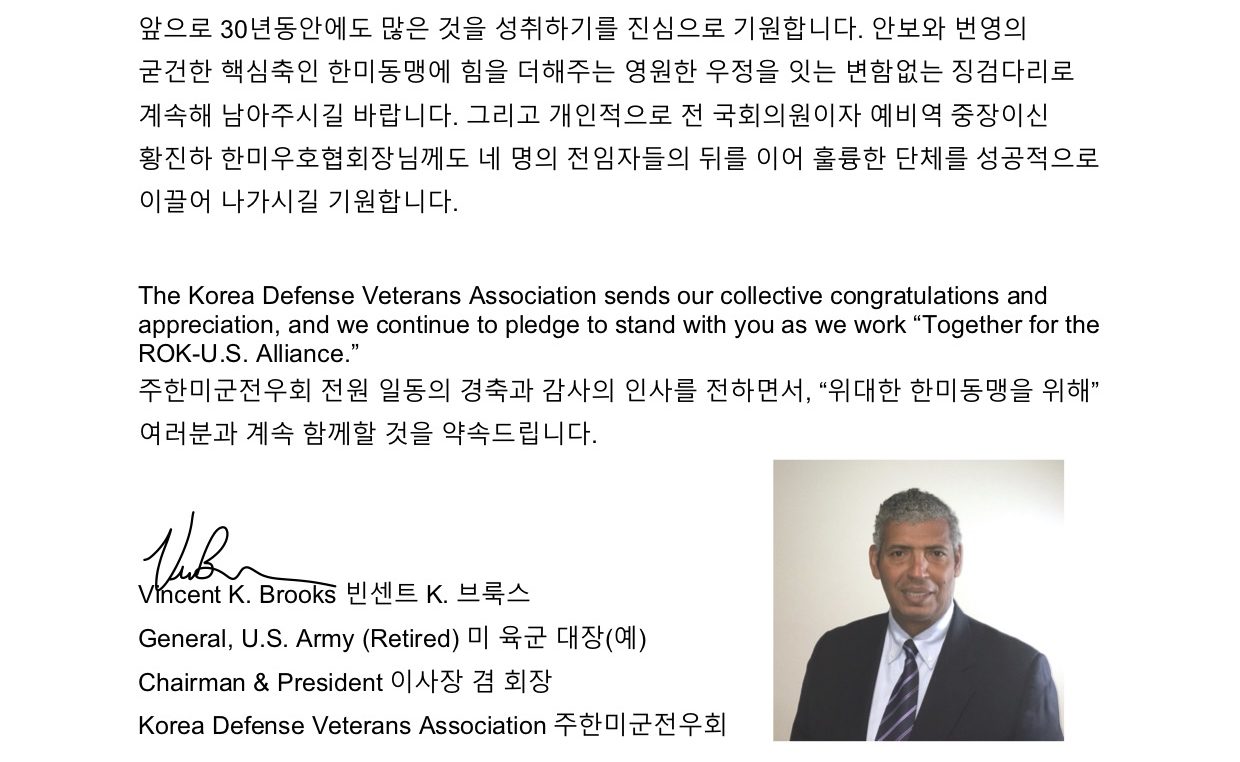 이상으로 우리 회원들과 한미동맹재단,대한민국 국가보훈처,모든 기부자들,후원자들, 협력기관들,자원봉사자들,우리 임원진들과 자문위원회 그리고 사무국 직원들에게 감사의 인사를 전하며 마무리 하겠습니다. 2021년은 주한미군전우회에게 강렬한 한 해였으며 이 기관을 2022년에도 이끌게 될 것을 저는 매우 영광으로 생각하며 한편 겸손하게 받아들이고자 합니다. “함께해요, 위대한 한미동맹을 위하여!”