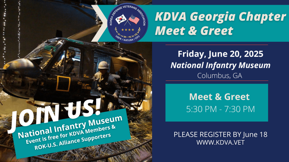 Overlooking the National Infantry Museum’s Korean War Memorial, this event will honor the service of our Korean War Veterans and recognize the contributions of the 3.3 million servicemembers who have served in the Republic of Korea since the signing of the Armistice. The ROK – U.S. Alliance began on the battlefields of war and has grown to include economic partnerships throughout many of Georgia’s communities. Whether you served in Korea, have a passion for supporting our veterans, or want to learn more about the ROK – U.S. Alliance, this event is for you.
